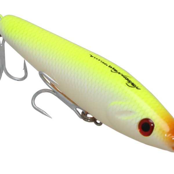 Isca artificial superfície com pitão de arrasto na extremidade superior e lastreada na parte inferior, a sua posição na água é vertical (em pé) com aproximadamente metade do corpo para fora dágua quando tracionada com toques de ponta de vara, a ação é de um peixe ferido agonizando na superfície.